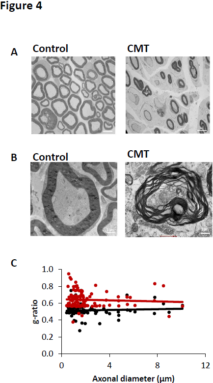 In sciatic nerve, the reduction of myelin sheath leaded to a significant increase of g-ration at 0.6408 ± 0.009 for CMT mice whereas the control mice presented a g-ratio mean of 0.515 ± 0.0062 (Figure 4C).