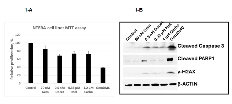 Figure 1. In vitro experiments in an embryonal carcinoma cell line (NTERA-2). 1-A: Cell proliferation (MTT) assay with cells exposed for 48 hours to 10% inhibitory concentrations (IC10) of each drug and the four combined (GemDMC). Error bars denote the standard deviation after 3 experiments. No statistical comparisons were performed. 1-B: Representative Western blot showing increased expression of protein associated with DNA damage (γ-H2AX) and apoptosis (cleaved caspase 3, cleaved PARP1) after exposure to GemDMC as compared to after each individual drug. The β-actin protein served as internal control. The antibodies used for immunoblotting are listed on Supplemental Table 1. Gem: Gemcitabine; Docet: Docetaxel; Mel: Melphalan; Carbo: Carboplatin.