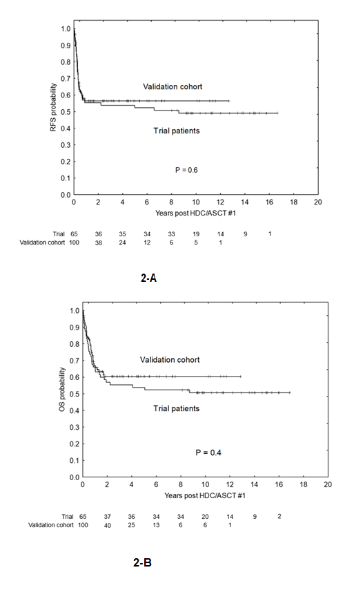Figure 2. Patient outcomes. 2-A: Relapse-free survival (RFS) of trial patients (N=65) and the validation cohort (N=100). 2-B: Overall survival (OS) of trial patients and the validation cohort. Statistical comparisons used the log-rank test.