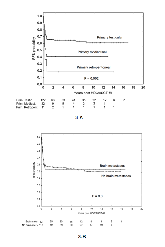 Figure 3. Outcomes of special populations. 3-A: Relapse-free survival (RFS) stratified by primary tumor site: testicular (N=122), mediastinal (N=32), or retroperitoneal (N=11). 3-B: RFS of patients with (N=52) and without (N=113) brain metastases. Statistical comparisons used the log-rank test.