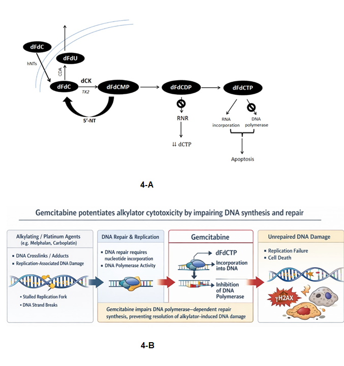 Figure 4. Synergistic interaction between gemcitabine and alkylating agents. 4-A: Intracellular activation of gemcitabine (dFdC, difluorodeoxycytidine) through sequential phosphorylation steps by the enzyme dCK (deoxycytidine kinase) with final production of its active metabolite dFdCTP (dFdC triphosphate), responsible for the inhibition of DNA polymerase. In this process, the intermediary metabolite dFdCDP (dFdC diphosphate) inhibits ribonucleotide reductase (RNR), which results in depletion of cellular pools of nucleotides. In our trial, the intracellular activation of gemcitabine was optimized by its continuous infusion at a fixed dose rate, which avoids saturation of dCK. 4-B: Graphic representation of the mechanism of synergy between gemcitabine and alkylators via inhibition of DNA damage repair.
