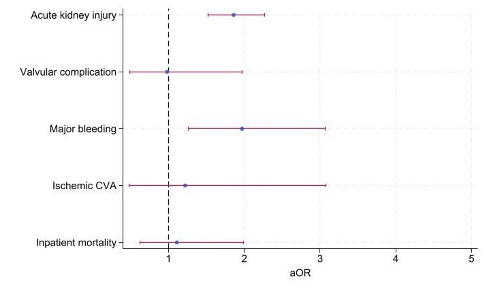 There was no difference in in-hospital mortality between patients with or without recent AMI (1.1% in both groups, adjusted odds ratio [aOR] 1.11, 95% CI: 0.62–1.99, P=0.72). There was no significant difference in ischemic CVA (aOR 1.22, CI 0.48–3.08, P=0.68), and valvular complications (aOR 0.98, CI 0.49–1.97, P=0.95). Major bleeding was higher among patients with recent AMI (aOR 1.97, CI 1.26–3.07, P=0.003) as well as the incidence of AKI (aOR 1.86, CI 1.52–2.27, P<0.001) (Figure 2). There were no patients with a recent AMI group who had conversion to open surgery, so the comparison was not feasible. TAVR for patients with a recent AMI was associated with longer hospital stay (adjusted mean difference [aMD] 0.96 days, CI 0.48 to 1.44, P<0.001) and higher total charges (aMD $15,489, CI 6,818–24,160, P<0.001). The primary and secondary outcomes are summarized in Table 2.