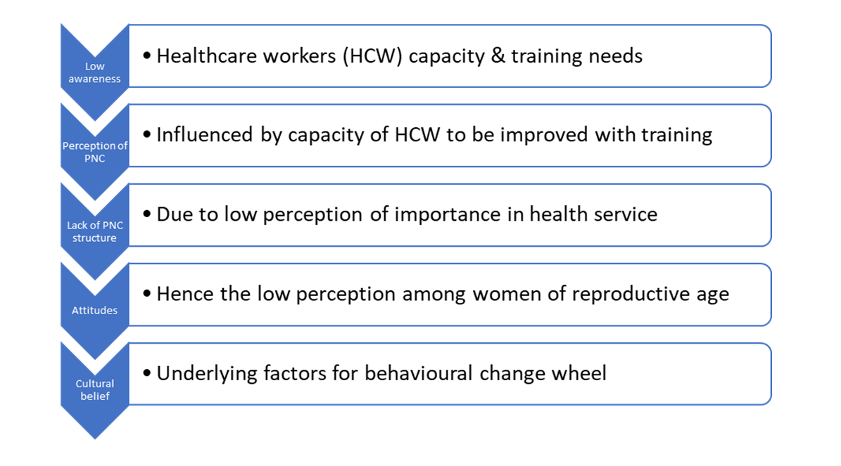 Observations being reported: Barriers to the utilization of PNC services cuts across Health Workers’ training needs as well as low perception of its importance amongst women of reproductive age.
