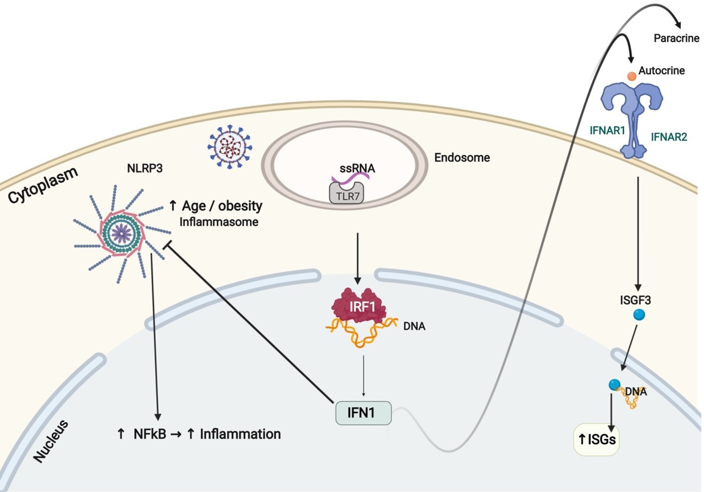 Aging and obesity are the two main risk factors for severe COVID-19. The central player identified in predisposing aging and obese patients to cytokine storm is NLRP3, an inflammasome that activates NFκB, generating a pro-inflammatory cytokine response [24]. The activity of NLRP3 is under direct control by sirtuin 2 (SIRT2). In older individuals over 65, a decrease in NAD+ levels reduces the activity of SIRT2, leading to hyperactivation of NLRP3 and increased cytokine storms found in older COVID-19 patients [30]. In addition, obesity has been found to increase the activity of NLRP3 in mice, explaining the increased mortality in obese patients as well [31]. Interestingly, IFN Is have been implicated in counterregulating NLRP3. IFN Is stimulate NO production and suppress ROS generation leading to suppression of NLRP3 activation [32,33]. Low or absent levels of IFN I lead to the unchecked activation of NLRP3, further predisposing elder and obese patients to severe form of COVID-19. In addition to activating the innate and adaptive immune system, IFN I suppression of NLRP3 is another therapeutic mechanism against COVID-19 (Figure 2).