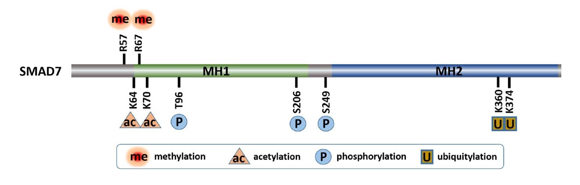 Post-translational modifications (PTMs) of the Smads allow for orchestrated regulation and fine-tuning of the TGFβ signaling system. The phosphorylation and dephosphorylation of R-Smads have been extensively studied and documented as a symbolic feature of TGFβ signaling [4]. The best known PTMs of Smad7 include ubiquitylation by SMURF2, as well as deubiquitylation, acetylation, deacetylation and phosphorylation [10], governing the stability and activity of SMAD7, which further control TGFβ/SMAD signaling [4,11-13] (Figure 1).
