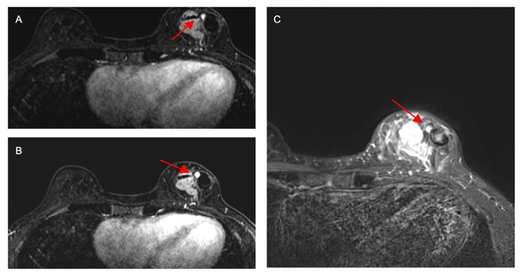 Figure 1. Axial T1-weighted contrast-enhanced subtracted breast MRI (A, B, and C) demonstrating medial enhancing left breast cancer,adjacent non-enhancing hematoma laterally, and central 6×6×5 mm round, homogeneously enhancing PSA. Key findings show a narrowneckedcommunication and signal intensity correlating to a stable hematoma within the PSA. MRI: Magnetic Resonance Imaging; PSA:Pseudoaneurysm.