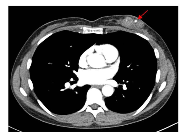 Figure 2. Axial contrast-enhanced chest CT showing enhancement with the left breast PSA. Focal hyper-density within the known carcinomamedial to the PSA corresponds with the biopsy marker. Key findings include outpouching of contrast from connected parented vessel and clear delineation of surrounding structures. CT: Computerized Tomography; PSA: Pseudoaneurysm.