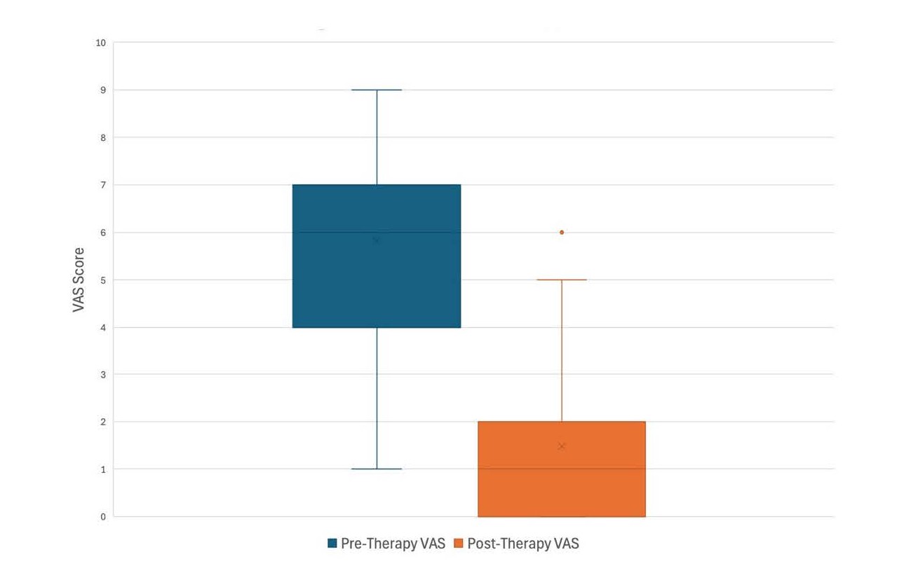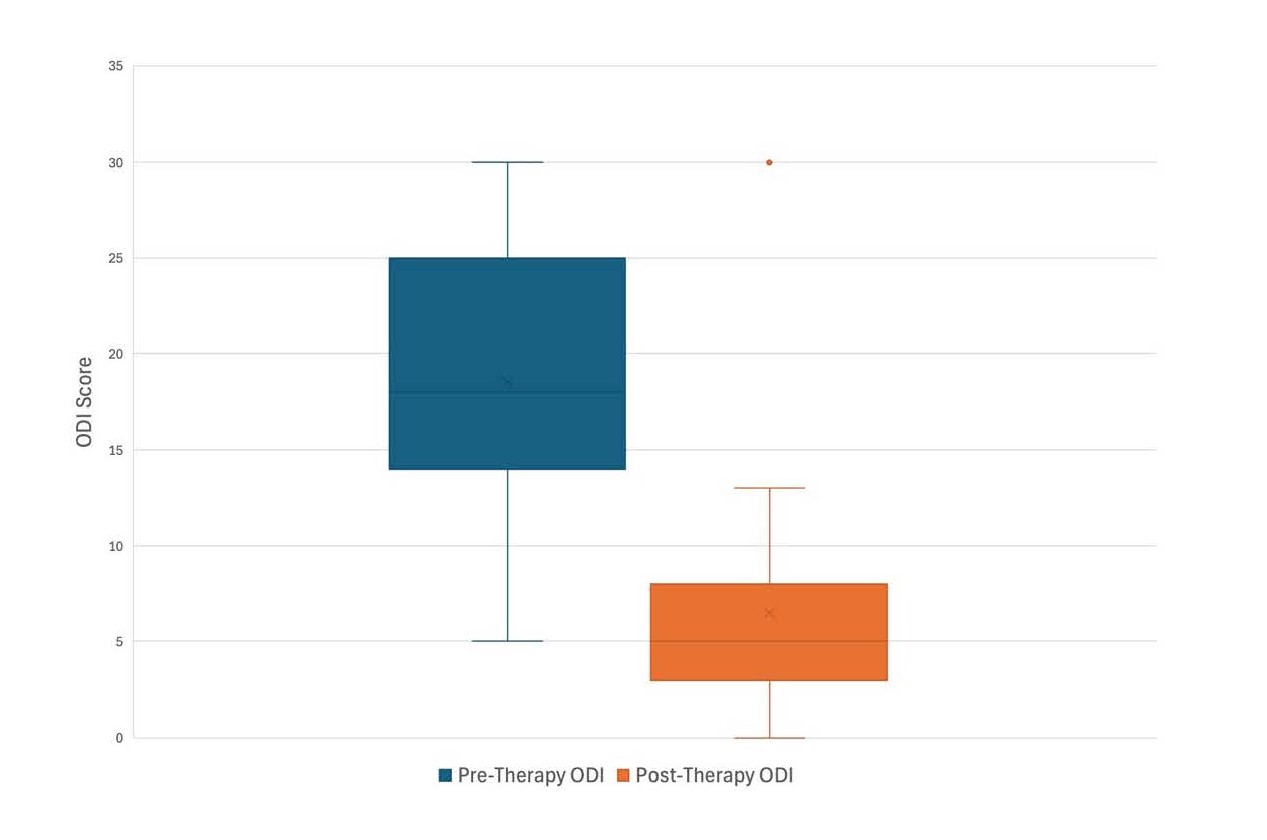 Results: Mean VAS scores decreased from 5.8 to 1.5 (p < .0001; Cohen’s d = 2.16), and ODI scores improved from 18.5 to 6.5 (p < .0001; Cohen’s d = 1.69), indicating large and statistically significant improvements in pain and function. No adverse events were reported.