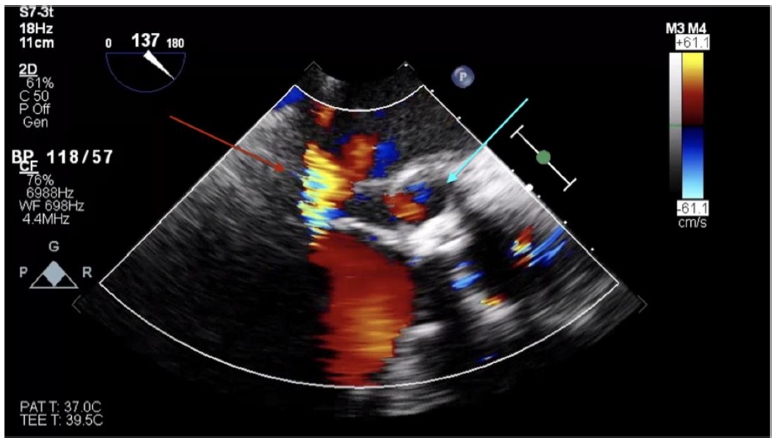 Percutaneous closure of the paravalvular leak was considered, but interventional cardiology recommended conservative management due to the patient’s stability. Electrophysiology was consulted to evaluate potential ICD extraction; TEE and chest radiography showed no lead vegetations or abnormalities, and the device was left in place due to high procedural risk.