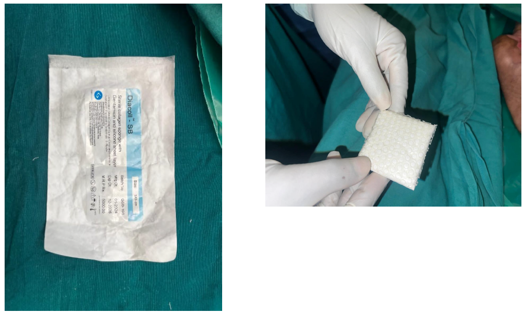Burns are a common problem which accounts for a share of morbidity and mortality for every country. The management of post burns wounds pose a challenge and early wound healing can reduce morbidity to the patients, allowing a chance for early restoration back to their normal life. Continuous research has led to advancements in burn wound care to allow for early wound healing and better functional recovery [1]. Conventional treatments for burn wounds often include debridement and skin grafting, which are resource-intensive and not without complications. The need for alternative solutions has led to the development of bioengineered materials like Diacoll-SB Dermal Regeneration Template. Diacoll-SB is a collagen-based matrix designed to support dermal regeneration, enhance wound healing, and reduce scar formation. Dermal substitute is defined as biomatrices which fulfil the function of cutaneous dermal layer and provides matrices and scaffold for new tissue growth and thus increases the rate of wound healing [2]. The collagen-GAG scaffold helps in supporting the in-growth of connective-tissue cells, thus causing regeneration of tissue providing the critical physiological functions of dermis [3].