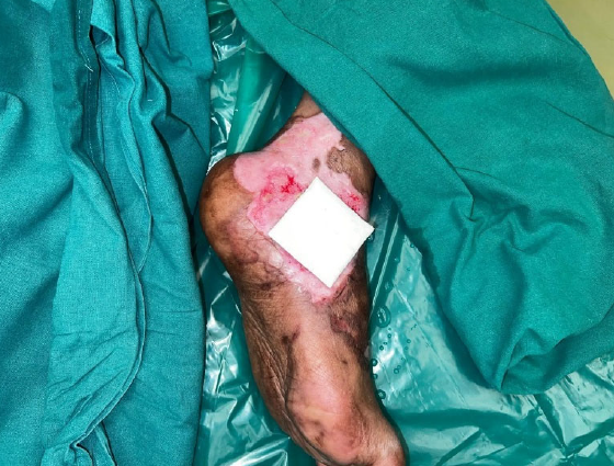 A 42 years old female presented to the tertiary care burn centre with a history of accidental scald burns due to hot water 5 days back. Patient had mixed second-and third- degree scald burns over her abdomen, left ankle and right thigh with approximately 5% body surface area as per Lund and Browder Chart. On admission, patient was managed as per ATLS guidelines. Adequate analgesia and fluid resuscitation as per Parklands formula were started. A collagen dressing was done on admission which was repeated every day. POD-3 revealed most of the post burn wounds healed well except for 3% post burn raw area over left ankle, abdomen and right thigh. Patient was operated for Hydrojet debridement of slough with regenerative wound therapy with sucralfate. Regenerative collagen scaffold Diacoll – SB (Figure 1) dressing was done on POD-10 under LA (Figure 2). Upon removing the dressings on POD10 revealed most of the post burn wounds healed well. A collagen dressing was removed and the wounds had healed completely on POD 11. Patient was advised for 1 month with post burn scar management in the form of compression garments, coconut oil massage, silicone gel and sunscreen application. All wounds healed well without hypertrophic scar formation or wound breakdown on follow up upto 1 month.