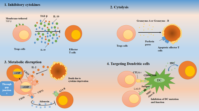 Figure 2. Mechanism of action of regulatory T cells: Tregs cells can utilize four major mechanisms to induce immunosuppression. 1. The secretion of inhibitory cytokines, 2. Cytolysis by secretig Granzyme A or Granzyme B, 3. The metabolic disruption of effector T cells, 4. By targeting antigen presenting cells (Dendritic cells).