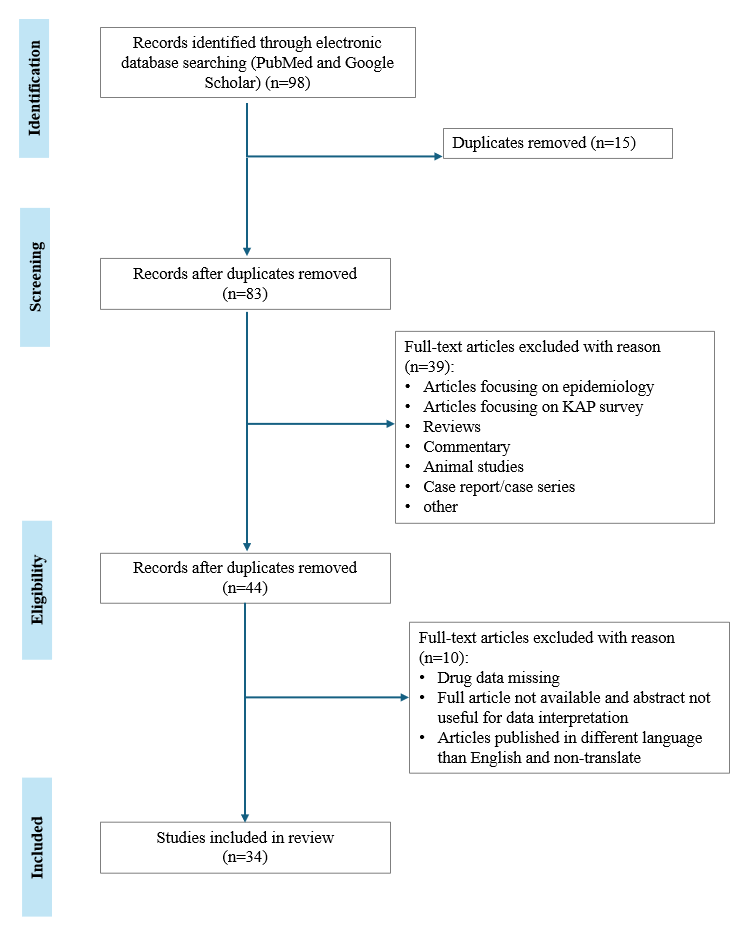After a comprehensive investigation of two databases, a total of 98 articles were scanned and searched. Out of these, 34 articles were included. Literature search and flowchart for screening are presented in Figure 1.