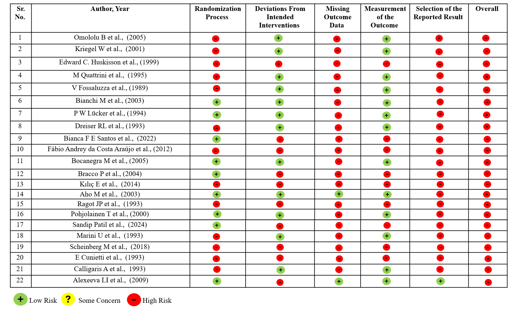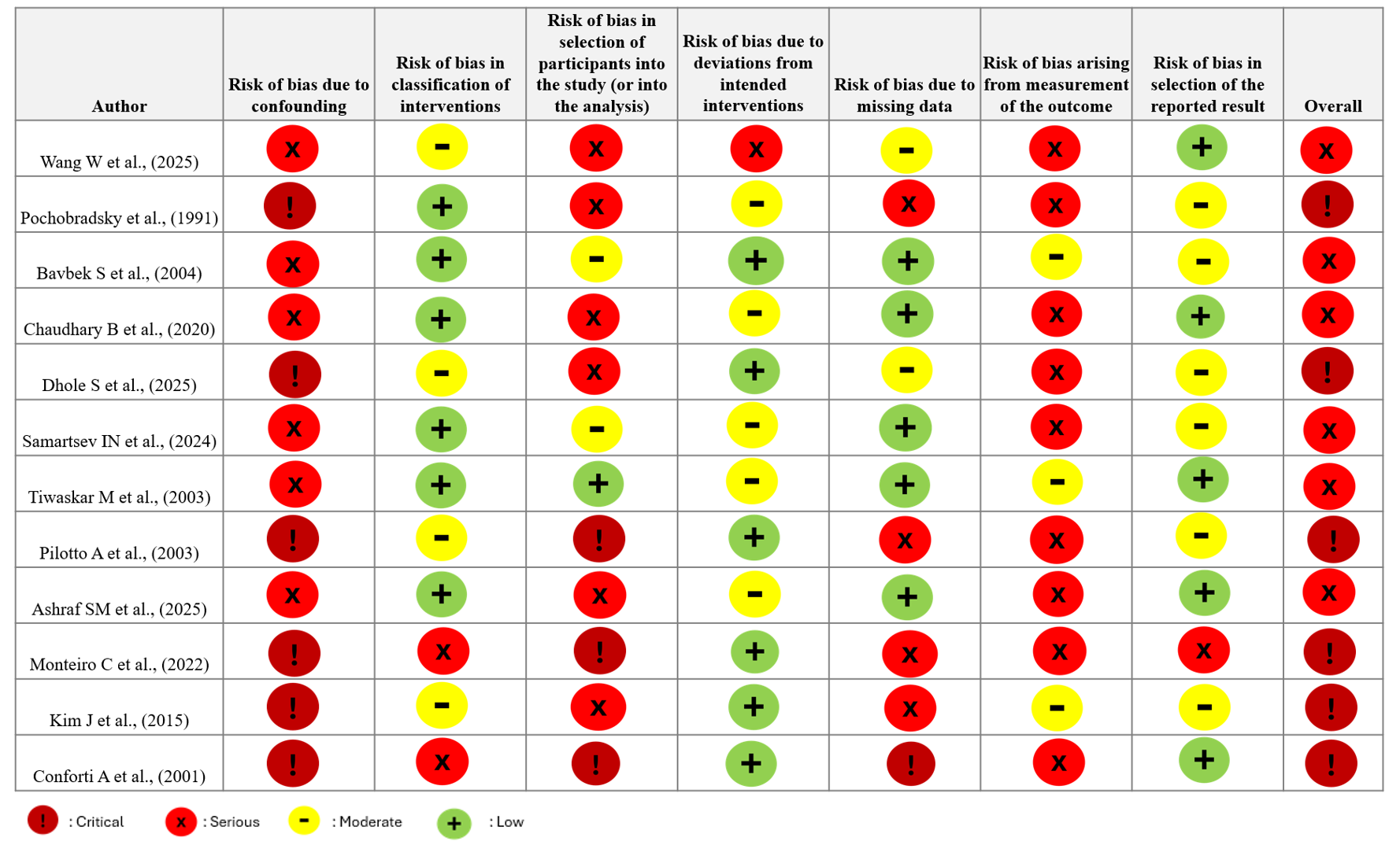 For randomized studies, using the Risk of Bias 2 (RoB2) tool, and the Risk of Bias in Non-Randomized Studies of Interventions (ROBINS-I) tool, two reviewers (X.X and X.X) independently assessed the risk of bias [17,18]. A third reviewer (X.X) was involved, or through a conversation, the disagreements were settled.