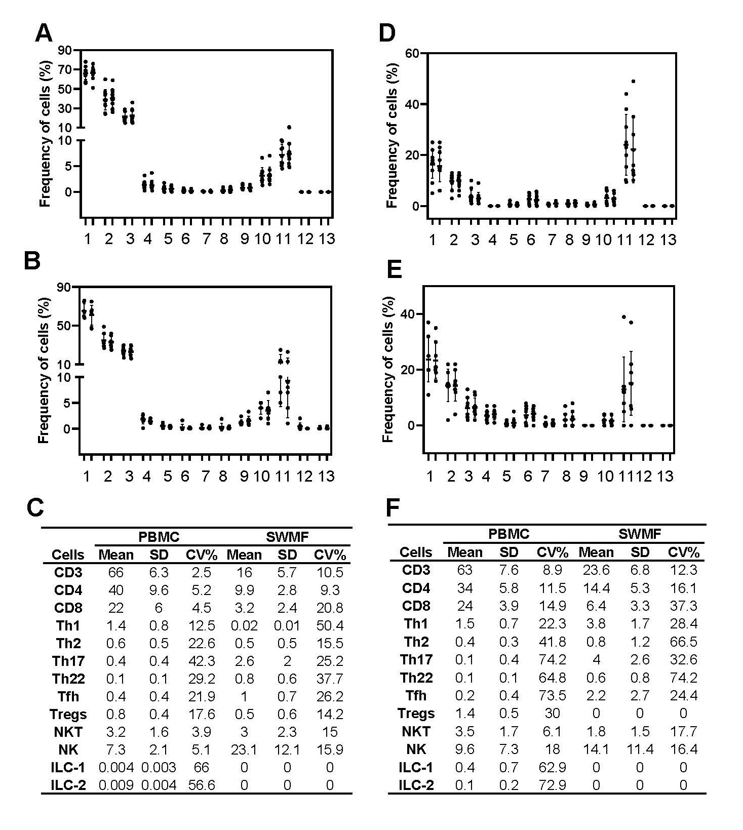 Figure 1 shows the technical reproducibility and biological consistency in the mean frequencies of the various cell types in the PBMC and SWMF. For the technical reproducibility determination, two split sample replicates from healthy controls (HC) were processed (N=5–11) independently based on the adequacy of the samples. For the biological consistency determination, PBMC and SWMF samples were collected four weeks apart from HC. ILC1 and ILC2 cells were not detected in these SWMF samples. ILC3 were not detected in either PBMC or SWMF. The frequencies of the duplicates of each of the cell types are shown in Figure 1A (PBMC) and Figure 1B (SWMF). The frequencies of the cell types in the longitudinal samples are shown in Figure 1D (PBMC) and Figure 1E (SWMF). Mean frequencies and the means of the CV% are shown as table insets (Figure 1C and 1F).
