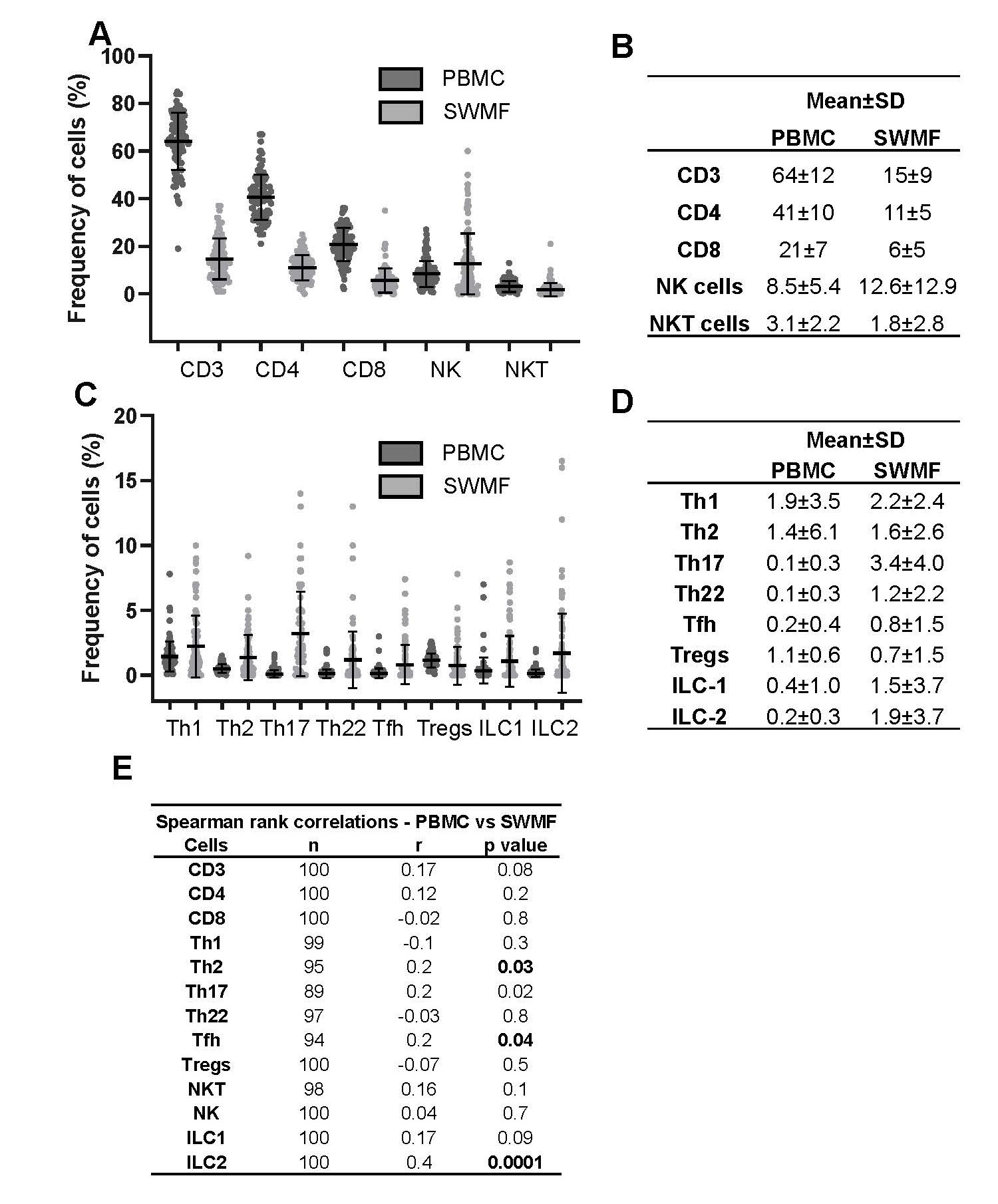 The mean frequencies (calculated over mononuclear leucocytes; Figure 1C) were higher in PBMC than SWMF for CD3 (66% vs 16%), CD4 (40% vs 9.9%), CD8 (22% vs 3.2%), Th1 (1.4% vs 0.02%), Th2 (0.6% vs 0.5%), ILC1 (0.004% vs 0%) and ILC2 (0.009% vs 0%) cell types. For Th17 (0.4% vs 2.6%), Th22 (0.1% vs 0.8%), Tfh (0.4% vs 1.0%) and NK (7.3% vs 23.1%) cells, the mean frequencies were higher in SWMF than PBMC suggesting a more prominent mucosal role for these cell types. Our distribution of the mononuclear cells in SWMF is very different from that of PBMC and similar to that previously shown by Vidovic et al. [6].