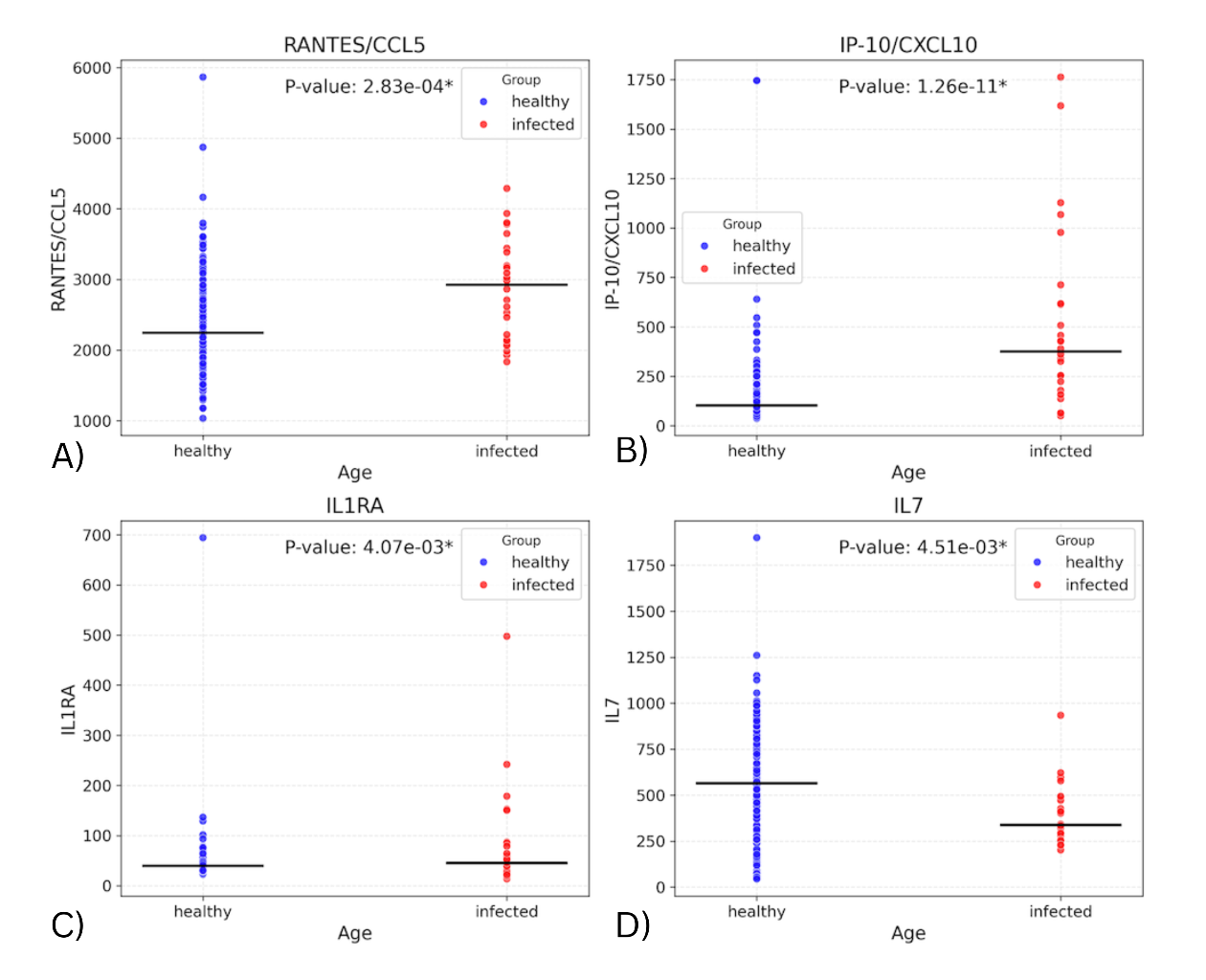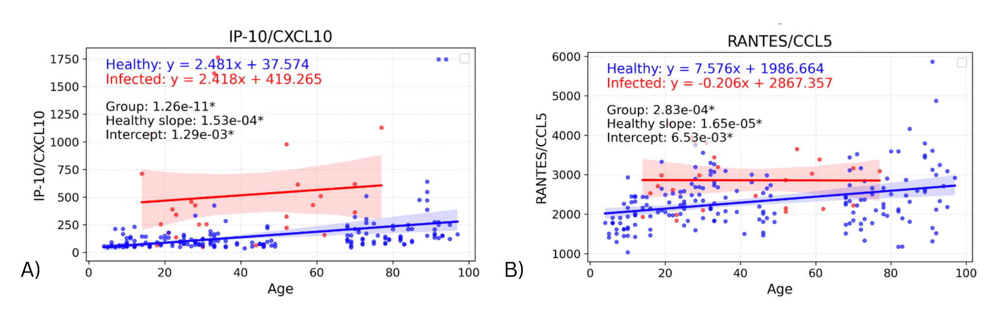 The same linear regression models were used to identify significant differences in intercept between the infected and healthy groups. These were only found in two biomarkers: IP-10 (p=0.00129) & RANTES (p=0.00653), shown in Figure 3. For these cytokines, the intercept difference suggests an effect of infection on the youngest individuals, as the intercept represents the predicted cytokine baseline levels in the youngest individuals. In the graph for RANTES, the difference in biomarker values appears to decrease as age increases (though the slope difference was not significant), suggesting an age-dependent loss of response. For IP-10, the slopes for infected and healthy groups appear very similar, suggesting a consistent infection effect regardless of age.