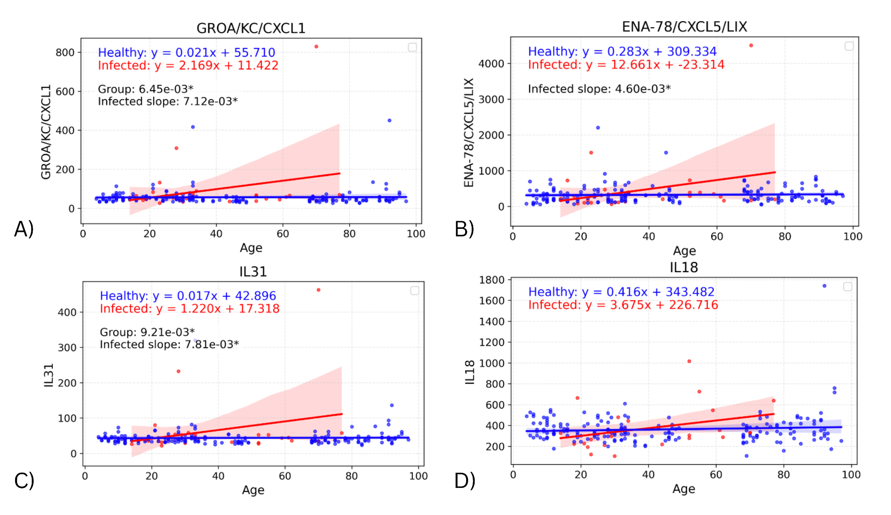 To assess whether the effect of infection on cytokine levels differed by age, a linear regression model was fitted on each cohort, with the interaction of age with biomarker and group also considered. Significant differences in the slope of both regression lines were found in four biomarkers: GROA (adjusted p=0.00712; p=0.00356), ENA-78 (adjusted p=0.00460, p=0.00230), IL-31 (adjusted p=0.00781; p=0.00391), and IL-18 (adjusted p>0.05; p=0.0421) (Figure 2). Comparing the slopes of these regression lines identifies any effects of infection on the change in biomarker values with age. In all four cytokines, the infected slope was found to be higher than the healthy, signifying a more pronounced response to infection in the elderly. However, the infected slope appeared to be highly influenced by a single elderly outlier, suggesting that these differences may not represent a consistent biological trend.