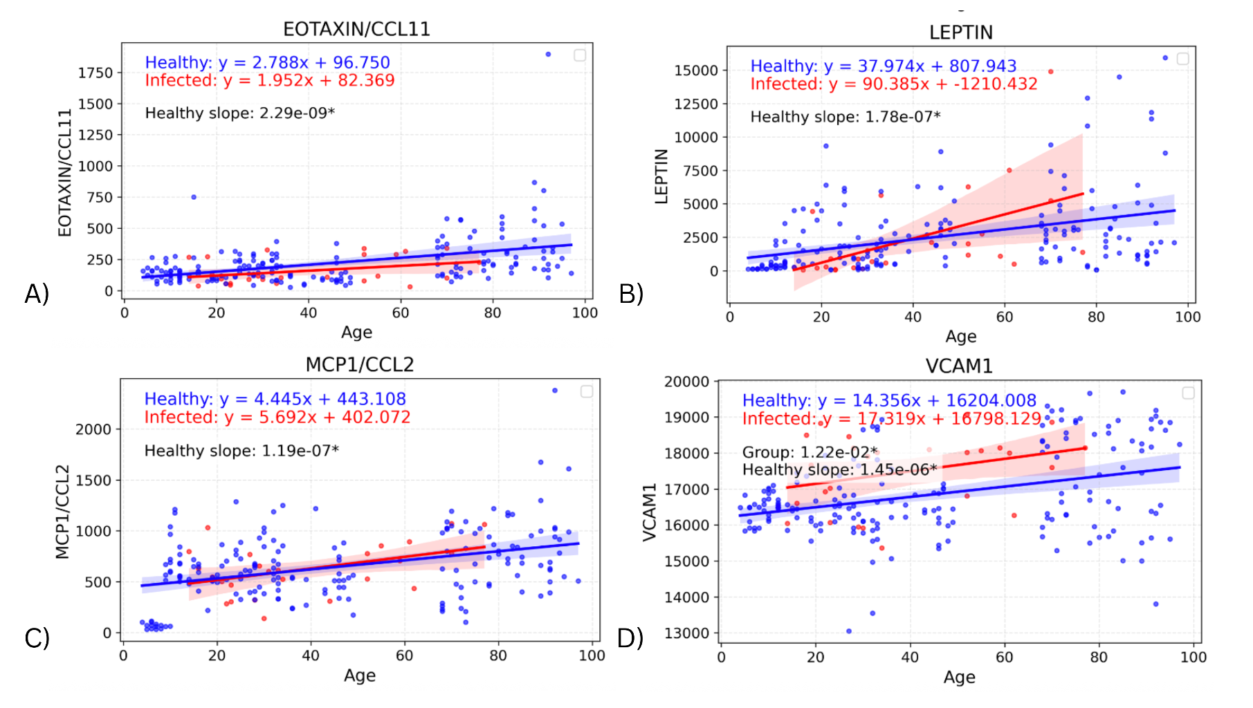 The slope of the healthy cohorts for each cytokine were also investigated on their own, with the p-value from the linear regression being used to determine whether the slope was significantly non-zero. Figure 4 depicts the regression lines for the four biomarkers with the most significant healthy slopes: EOTAXIN (p=2.29E-09), LEPTIN (p=1.78E-07), MCP1 (p=1.19E-07), and VCAM1 (p=1.45E-06) (Supplemental Table 2 contains the remaining seventeen cytokines and their corresponding p-values). These biomarkers support the expected change in levels due to age and also indicate an effect due to infection that is separate from the effect of age on cytokine values. In particular, the regression lines in Figure 4 show clear upward slope in the healthy cohort, consistently positive across all four biomarkers. These age-related increases in EOTAXIN, LEPTIN, MCP-1, and VCAM1 could reflect gradual changes in chemokine signaling, metabolic regulation, and endothelial activation with aging. The infected cohort has greater variability in slope (though it is still positive), suggesting that while age-related increases are apparent in healthy individuals, infection introduces additional dispersion in cytokine levels.