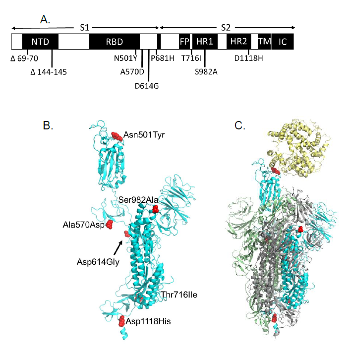 The cryoEM structure of the SARS-CoV-2 (Wuhan-Hu-1) RBD/ACE2-B0AT1 complex [3] (PDB 6M17) was used as the basis for modeling N501Y. The prefusion SARS-CoV-2 (Wuhan-Hu-1) spike glycoprotein with a single receptorbinding domain up [6] (PDB 6VSB) was used as the basis for modeling D570A, D614G, T716I, S982A and D1118H. Side chains were mutated in COOT [7] using rotamers that represent a local energy minimum of torsional angles.