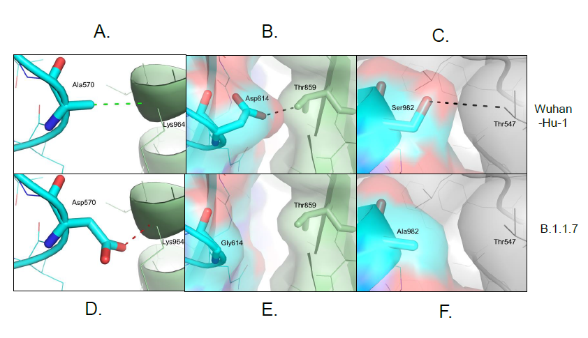 Figure 3. Mutations in the SARS-CoV-2 B.1.1.7 hinder intermolecular interactions between subunits of the spike glycoprotein. A. Ala570 in the spike glycoprotein from Wuhan-Hu-1 (blue) forms an intermolecular van der Waals (green dashes) contact with the main chain amide of Lys964 from the neighboring chain (grey). B. Asp570 in the SARS-CoV-2 UK variant is expected to form a repulsive interaction (red dashes) because of a potential clash with the main chain of the neighboring chain (grey). C. Asp614 in the spike glycoprotein from Wuhan-Hu-1 (blue) forms an intermolecular H bond with Thr859 a neighboring chain (green). D. Gly614 in the SARS-CoV-2 UK variant results in a loss of a H bond with Thr859 at the interface between two spike protein subunits (blue and green) of the trimeric protomer forming a potentially druggable structural pocket. E. Ser982 in the spike glycoprotein from Wuhan-Hu-1 (blue) forms an intermolecular H bond with Thr547 of a neighboring chain (grey). F. Ala982 in the spike protein of the UK variant (blue) prevents H bonding with Thr547 of a neighboring chain (grey).