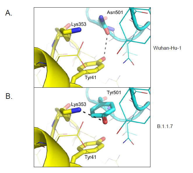 Figure 2. A mutation at position 501 in SARS-CoV-2 B.1.1.7 increases affinity for ACE2 by altering intermolecular interactions. A. Asn501 in the spike glycoprotein from Wuhan-Hu-1 (blue) forms a H bond (black dashes) with Tyr41 in ACE2 (yellow). B. Tyr501 in SARS-CoV-2 VUI 202012/01 form an aromatic stack with Tyr41 and a H bond with Lys353.
