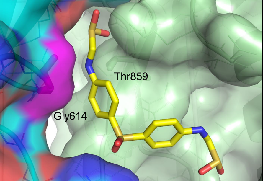 Since SARS-CoV-2 variants with D614G, such as UK variant B.1.1.7, currently predominate globally, we asked if the interface between individual chains of the spike protein trimer at position 614 may be druggable. A model of the spike protein trimer of the UK variant B.1.1.7 was used as the basis for molecular docking. 1,207 FDA approved drugs were docked to the interface site formed between position D614G and T859 of neighboring chains in the spike protein trimer. Drugs were estimated to bind the UK variant B.1.1.7 at the D614G site, such as the antileprosy drug sulfoxone, ΔG -24.4 kcal/mol (Figure 4). These data suggest that drugs may be developed to target highly transmissible SARS-CoV-2 strains including the UK variant B.1.1.7.