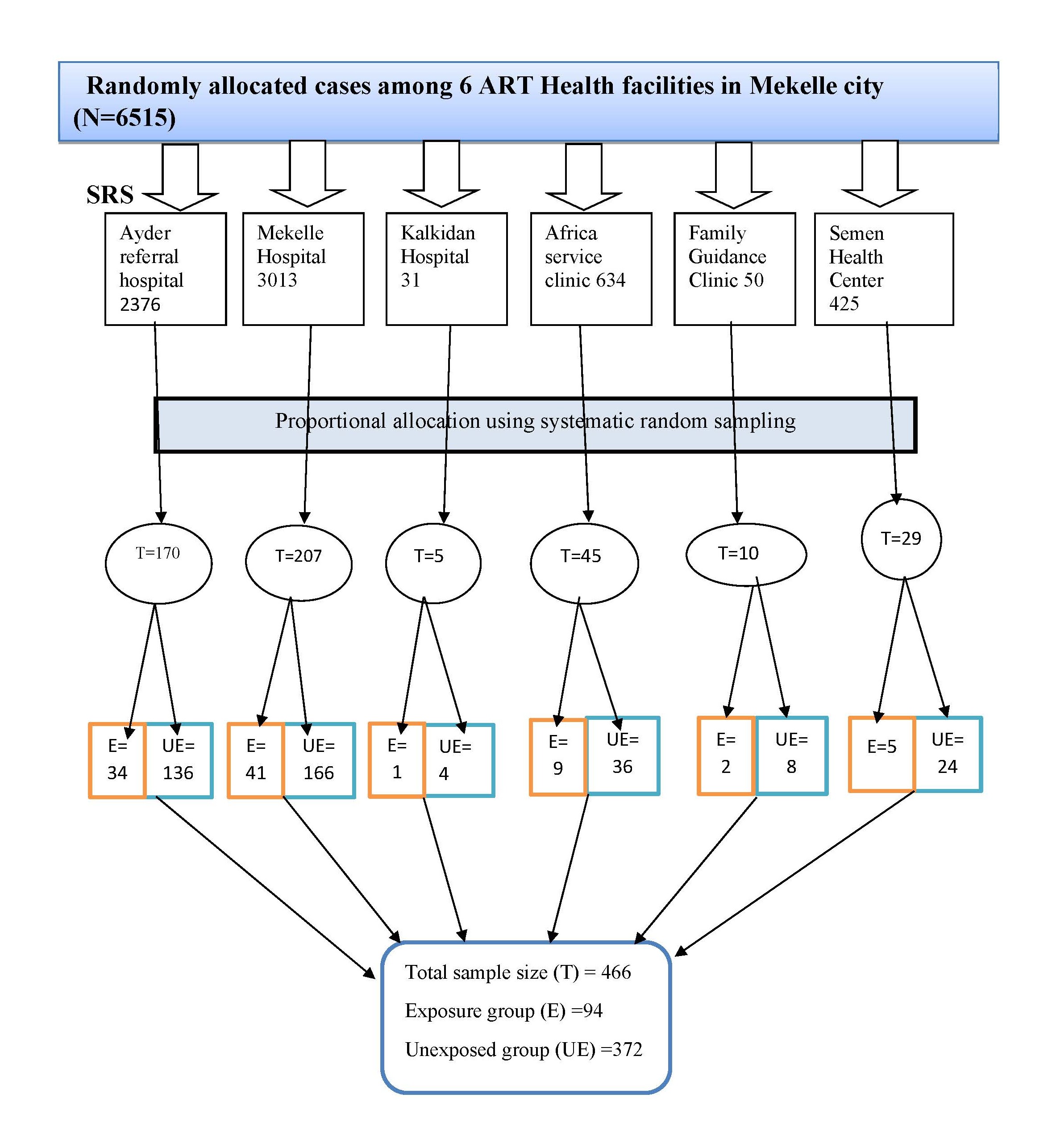 Sampling technique/ procedure: Six out of 14 ART health facilities in Mekelle were selected, using a simple random sampling method. In the study unit, 6,515 clients who started ART within the previous 8 years registered in the facility. Using this information as baseline, the total number of clients was assessed from each health facility using a systematic random sampling method, and the sample size was doubled using design effect (233*2=466, of which 94 were exposed and 372 were unexposed to HBV, 1:4). Finally, proportional allocation was employed for each health facility, additionally, and patient cards were assessed every 14 intervals (N/n=6515/466) (Figure 2).