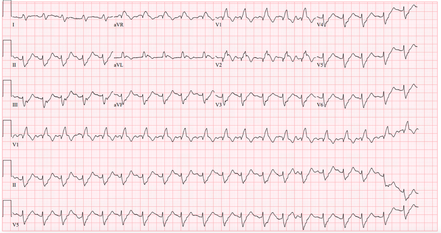 Figure 1: EKG on presentation: SVT (Supraventricular Tachycardia) with aberrancy, right bundle branch block, left axis deviation resembling bifasicular block.