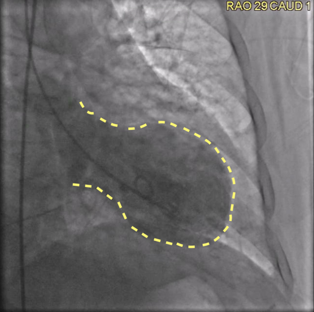 Figure 2: Coronary angiogram, right anterior oblique, caudal view revealing classical apical ballooning, as outlined with yellow striped line.