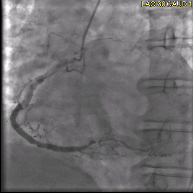 Figure 3: Coronary angiogram, left anterior oblique view, mild RCA beading, severely diseased RPDA.