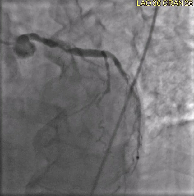 Figure 4. Left anterior oblique view showing severe stenosis at the ostium of LAD.