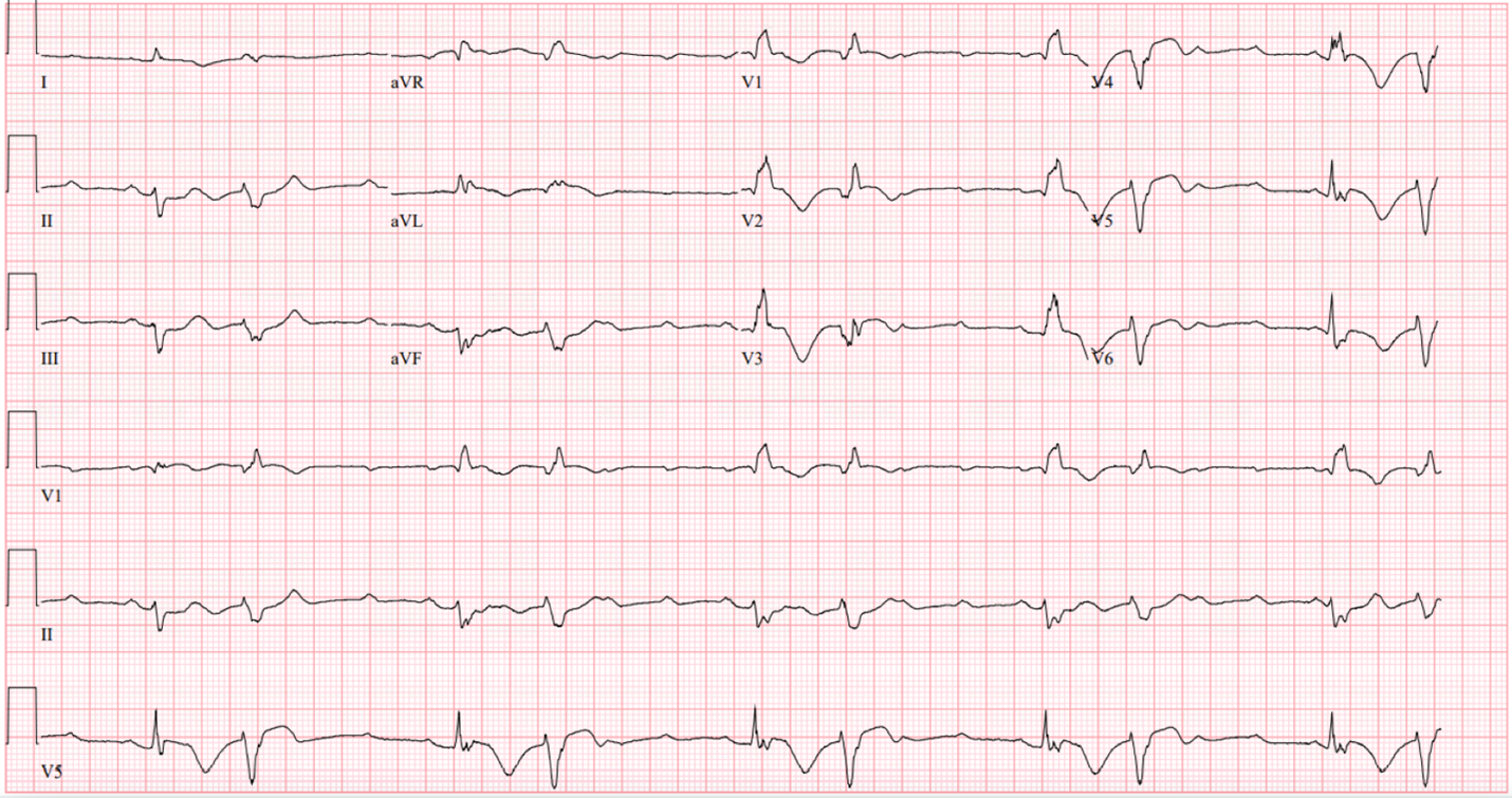 A plain chest radiograph revealed increased interstitial markings, but no acute fractures or pneumothorax. Electrocardiography shown below (Figure 1). Labs were notable for leukocytosis 19.0 10ˆ3/μL, high sensitivity troponin was 2,810 and later 33,119 pg/mL, brain natriuretic peptide was 90 pg/dL, and lactate level was 3.2 mMol/L. CT scan of the head was negative for acute events. CT angiography of the chest visualized an intact aorta and demonstrated no evidence of pulmonary embolism, pneumothorax, pulmonary contusion, or other acute traumatic injuries. Imaging of the abdomen and pelvis did not show solid organ injuries or free intra-abdominal fluid.