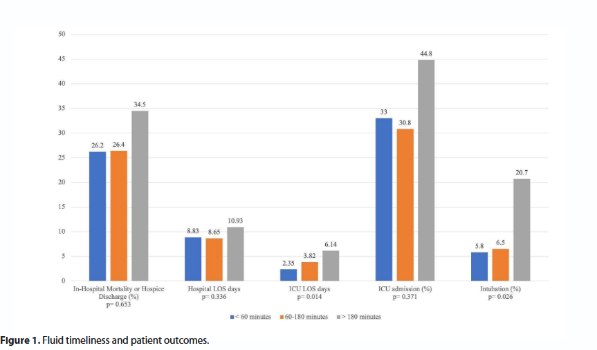 Results: 225 patients were included in this study. 46.2% received crystalloid before 60 minutes, while 40.9% and 12.9% of patients were resuscitated within 60-180 minutes and greater than 180 minutes, respectively. Baseline characteristics in all three groups were similar. There was no difference in composite in-hospital mortality or hospice discharge [27 (26.2%) vs. 24 (26.4%) vs. 10 (34.5%); p=0.653] between the three groups. The late crystalloid administration group had statistically significant longer ICU LOS [2.35 (3.99) vs. 3.82 (6.42) vs 6.14 (7.31); p=0.014] and increased intubation rate [6 (5.8) vs. 6 (6.5) vs. 6(20.7); p=0.026]. Regression analyses indicated that time-to-crystalloid directly correlated with hospital LOS, ICU LOS and intubation rate.