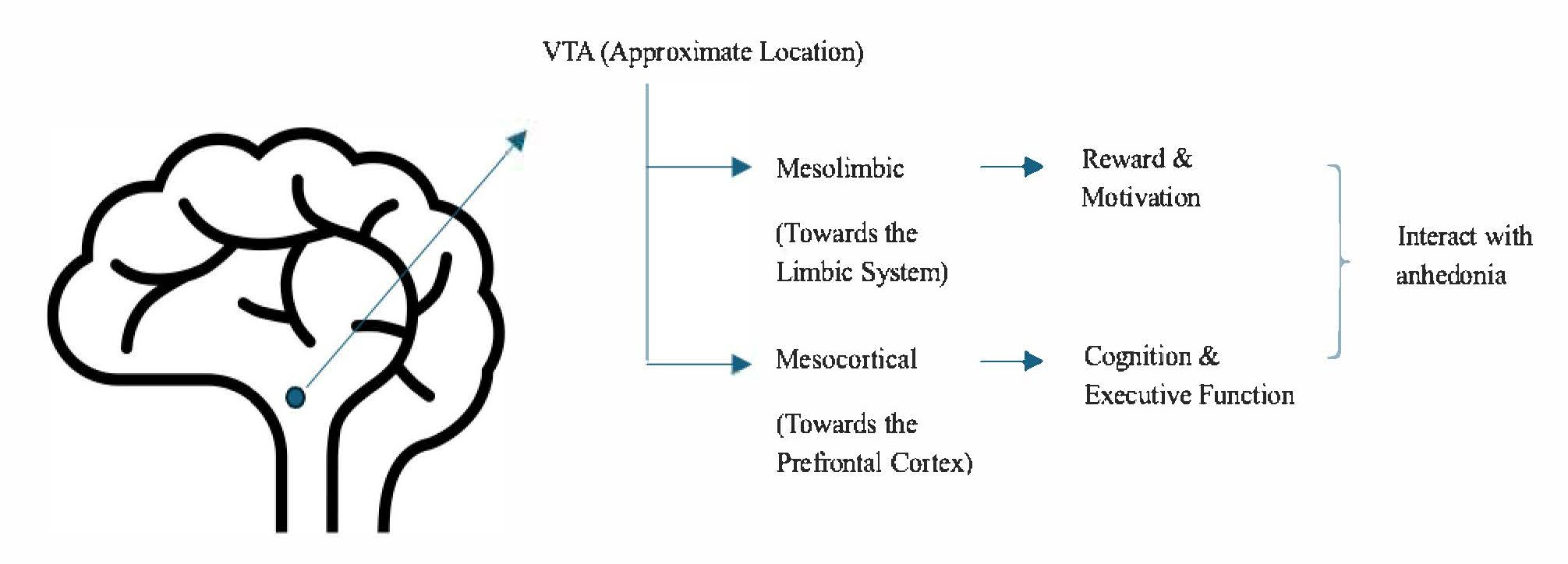 Figure 1. Schematic illustration of dopaminergic pathways implicated in schizophrenia. This figure depicts the principal dopaminergic circuits implicated in schizophrenia, with projections originating from the ventral tegmental area (VTA) and diverging into the mesolimbic and mesocortical pathways. Broadly, the mesolimbic pathway is associated with reward processing and motivation, whereas the mesocortical pathway supports cognition and executive functioning. Dysregulation across both pathways is thought to contribute to anhedonia.