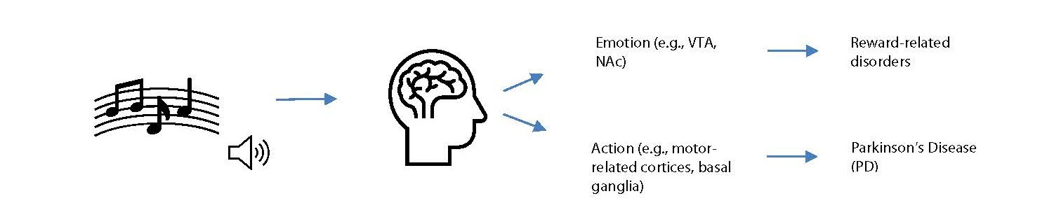 Figure 2. Music listening, brain responses, and clinical implications. This figure illustrates neuroanatomical regions responsive to music listening, with corresponding clinical interventions indicated on the right. Music listening engages distributed brain regions that could be generalized into “emotion” and “action.” Music-induced neural responses within “emotion” are thought to be applicable to reward-related disorders, whereas responses in “action” are considered to have implications for Parkinson’s disease (PD).
