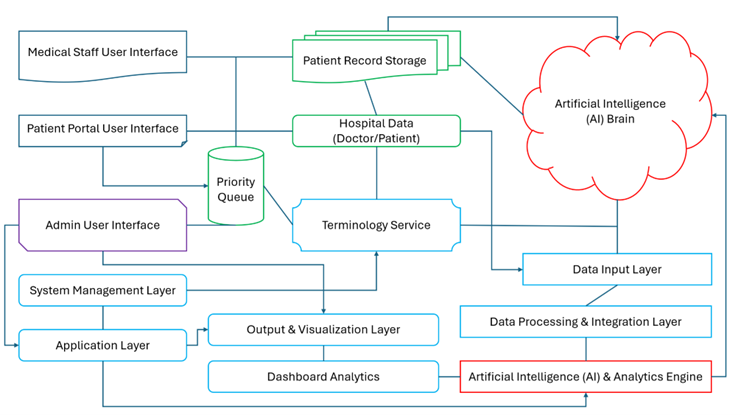 These challenges are particularly acute in developing nations such as Bangladesh, where digital health infrastructures remain fragmented and clinical workflows are primarily manual. Healthcare facilities frequently experience high patient volumes, limited human resources, and inadequate information management practices, leading to delays in diagnosis, inefficient queue handling, and poor prioritization of critical cases [4–6]. Although several pilot initiatives have introduced electronic recordkeeping systems, most lack AI-driven capabilities, interoperability features, and adaptive mechanisms needed to support dynamic healthcare environments. As a result, the potential of EHR systems to improve patient outcomes and operational efficiency remains significantly underutilized.