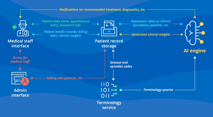 The first phase of the design focused on embedding Artificial Intelligence (AI) functionalities to enhance usability and interactivity. This module was engineered to ensure an intuitive interface, promoting accessibility for both patients and healthcare providers, the primary system users. The AI-driven layer facilitated the handling of real-time data streams generated from user interactions, enabling adaptive responses and optimized resource allocation. While several features were conceptualized for future integration, the current prototype maintains a dynamic architecture capable of evolving in response to feedback and changing user demands.