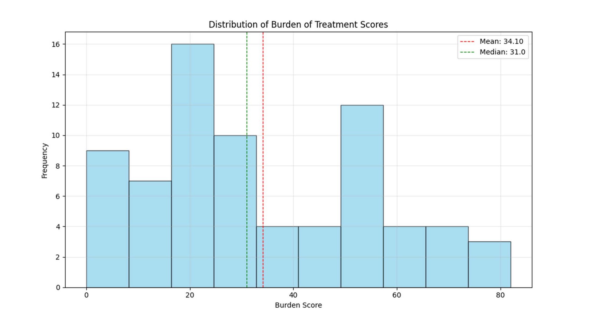 Figure 1. Distribution of burden of treatment Scores: Burden of treatment scores showed a right-skewed distribution, with most patients reporting low to moderate scores (mean 34.1, median 31.0).
