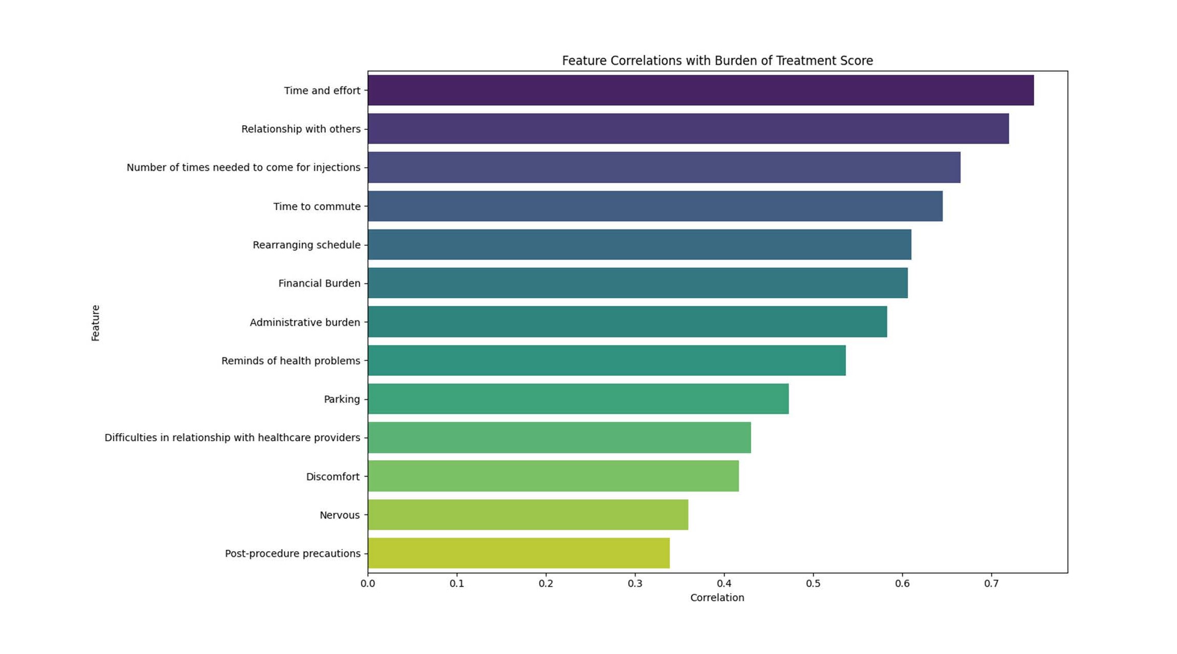 Figure 2. Feature correlations with burden of treatment score. Correlation with burden of treatment marked on x-axis. Each category is listed on the Y axis. Correlation analysis demonstrated that overall burden of treatment was most strongly associated with time and effort, frequency of injections, commuting, scheduling disruptions, financial burden, and impacts on relationships. In contrast, procedural discomfort, nervousness, and post-procedure precautions showed weaker associations, suggesting that logistical, social, and financial factors are the main drivers of treatment burden.
