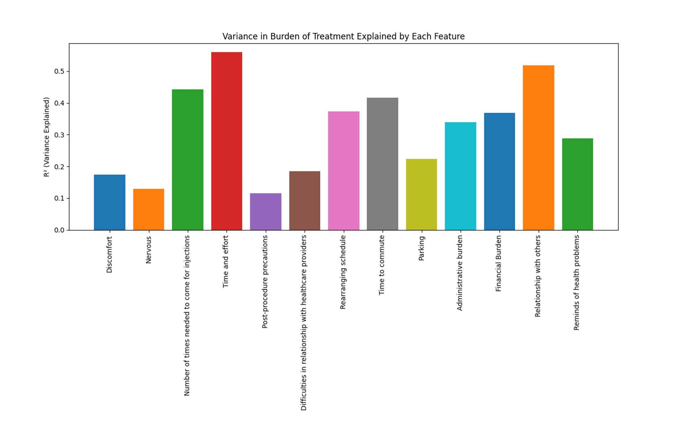 Figure 3. Variance in burden of treatment explained by each variable. Univariate variance explained in burden of treatment by each feature (bar height = R^2). Higher bars indicate stronger associations; bars are not additive and do not imply causation.