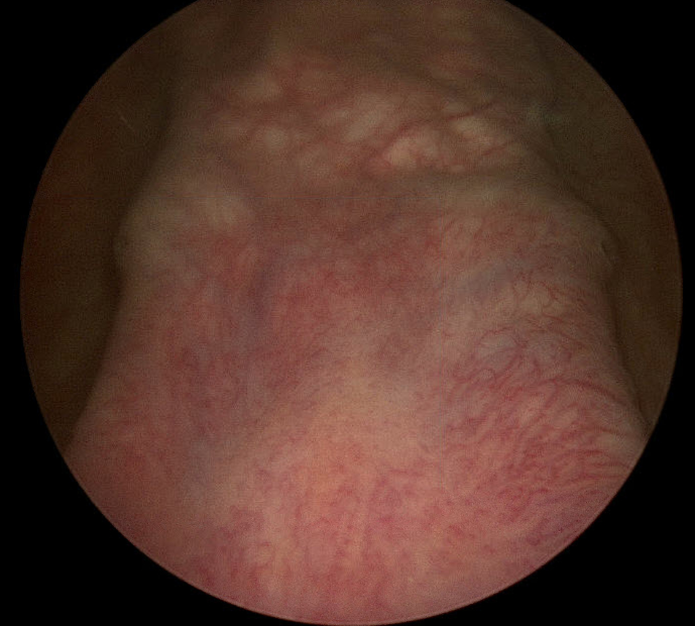 The patient was advised to follow a conservative management regimen, which involved the administration of non-steroidal anti-inflammatory drugs (NSAIDs) and subsequent cystoscopy at 2 and 4 weeks. The patient declined catheterization despite our strong recommendations. At the 2-week follow-up, the patient had no lower urinary tract symptoms and the cystoscopy revealed a substantial reduction in thermal injury (Figure 2).