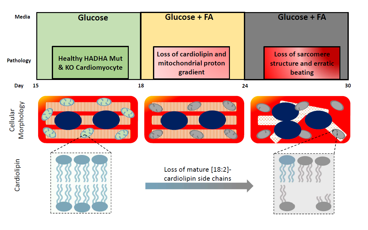 MTP deficiency results in sudden unexplained infant death, Reye-like syndrome, cardiomyopathy and/or skeletal myopathy [1,6,7]. A major phenotype of MTPdeficient newborns is sudden infant death syndrome (SIDS), which manifests after birth once the child begins nursing on lipid-rich breast milk. Defects in FAO have a role in promoting a pro-arrhythmic cardiac environment, however, the exact mechanism of action was not understood, and there are no current therapies [8,9]. We (Miklas et al.) recently used human induced pluripotent stem cells from a HADHA patient and HADHA CRISPR edited iPSCs to model human MTP deficient cardiomyocytes, heart cells, to better understand the cardiac pathology [5]. Two key findings were made. The first was that HADHA mutant cardiomyocytes, when challenged with fatty acids, had defective calcium dynamics and repolarization kinetics which resulted in a pro-arrhythmic state. Second, defective HADHA led to abnormal cardiolipin remodeling resulting in the inability to produce and possibly maintain the acylchain composition of mature cardiolipin [10].