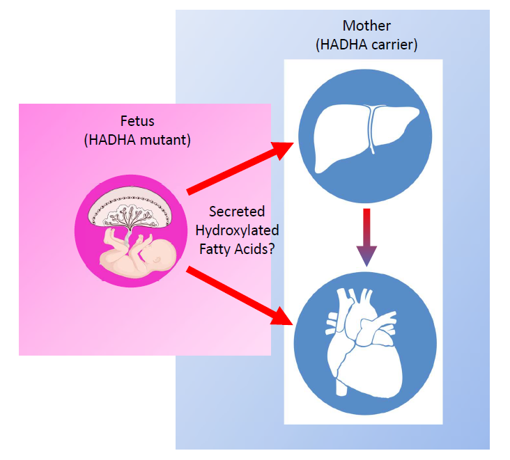 MTP deficiency is caused by mutations in either hydroxyacyl-CoA dehydrogenase/3-ketoacyl-CoA thiolase /enoyl-CoA hydratase subunit A (HADHA) or subunit B (HADHB). The result is a severe limitation in long-chain fatty acid oxidation (FAO) and is considered one of the more severe FAO disorders without pharmacological treatment [1]. Mitochondrial FAO disorders are recessively inherited, and defects in FAO are estimated to affect ~1 in 10,000 newborns [2]. This results in around 400 infants per year born in the USA with this condition that is potentially lethal and has no cure. In particular regions of Poland the frequency is over ten-fold higher [3]. Unfortunately, a mother carrying a MTP deficient fetus has a 30% chance of exhibiting pregnancy complications [4]. In particular, if the mother has a mutation in one copy of HADHA and the fetus has two copies of the HADHA mutation, the mother is more likely to have acute fatty liver of pregnancy (AFLP) and HELLP syndrome (hemolysis, elevated liver enzymes and low platelet count). Yet, little is known about how the mother develops AFLP and/or HELLP syndrome. MTP deficiency and human stem cell derived cell types provide an opportunity to better understand human cellto- cell communication in human physiology and disease pathology [5].
