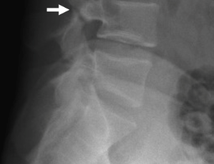Spondylolysis, a defect of the pars interarticularis, is a frequent cause of low back pain in young adults. A 19-year-old male presented with a year of chronic pain that recently worsened, limiting ambulation. He denied trauma, fever, neurological symptoms, or bowel/bladder dysfunction. Examination revealed an antalgic gait without focal tenderness or deficits. Given the underlying chronicity and functional limitation in a young patient, lumbar radiographs were obtained, which demonstrated a pars defect at L4.