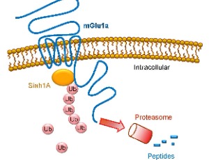 Metabotropic glutamate (mGlu) receptors are a family of G protein-coupled receptors. These receptors are widely distributed in the brain and are critical for the modulation of synaptic transmission and plasticity. Emerging evidence shows that mGlu receptors themselves are subject to a dynamic posttranslational modification involving protein ubiquitination.